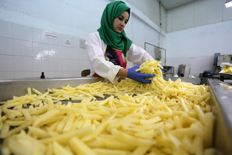 A Palestinian laborer works at a frozen food factory in Beit Hanoun, northern Gaza Strip, on 22 January. Potatoes have been washed, peeled and cut and are being checked for bruising and rot before being packaged.