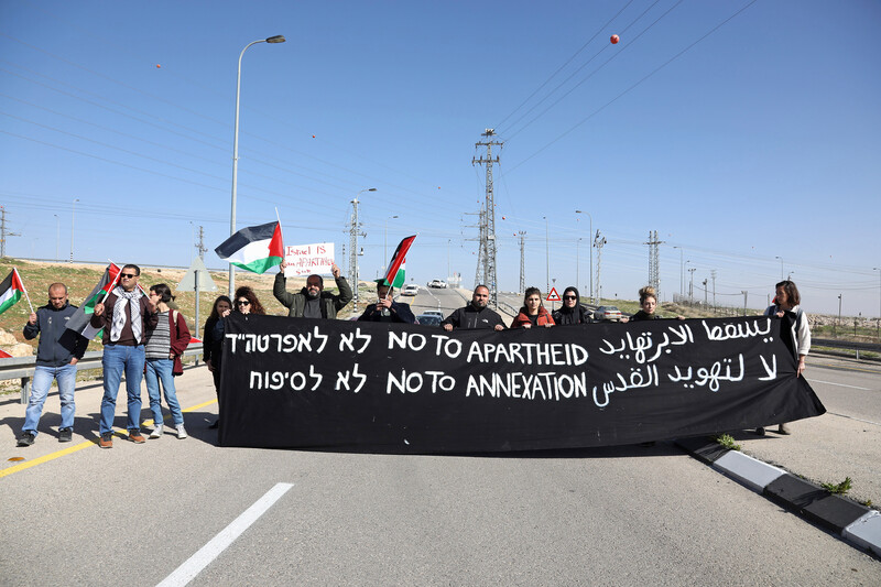 Palestinian, Israeli and international activists block a newly opened road segregating Palestinian and Israeli motorists with an eight-meter-high wall, 23 January. Palestinians and human rights groups say this is part of Israel’s Greater Jerusalem plan, which includes the expansion of the Maaleh Adumim settlement into the highly contested E1 area, the annexation of the suburban Jerusalem settlements, and is directly connected to attempts at displacing local Bedouin communities.