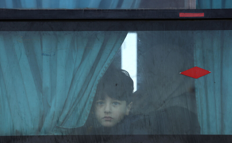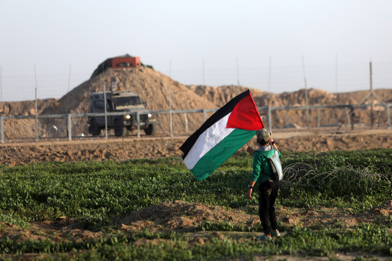 A Palestinian child waves his national flag towards an Israeli military jeep during Great March of Return protests east of Gaza City on 25 January.