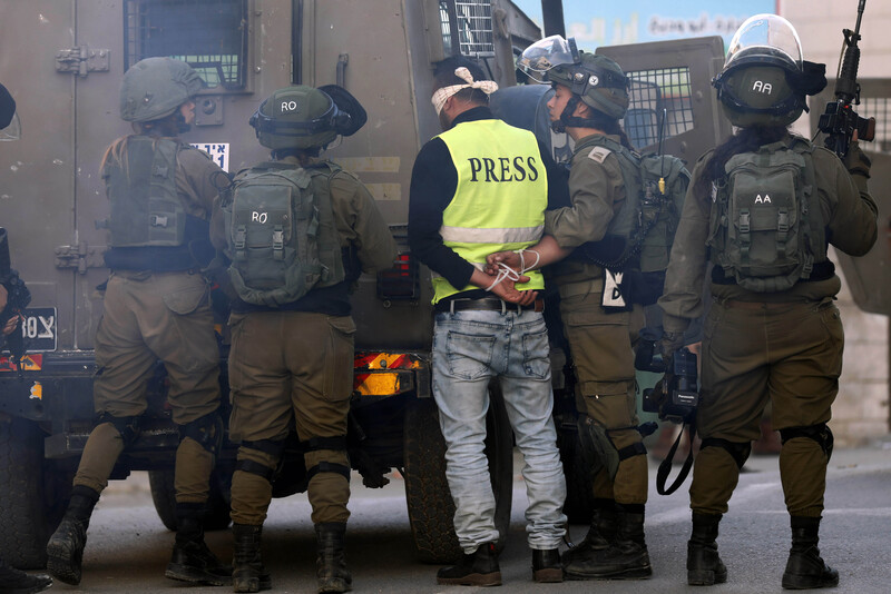 Israeli soldiers detain a Palestinian camera operator during confrontations with Palestinian protesters in the village of Tuqu near the West Bank city of Bethlehem, 25 January.