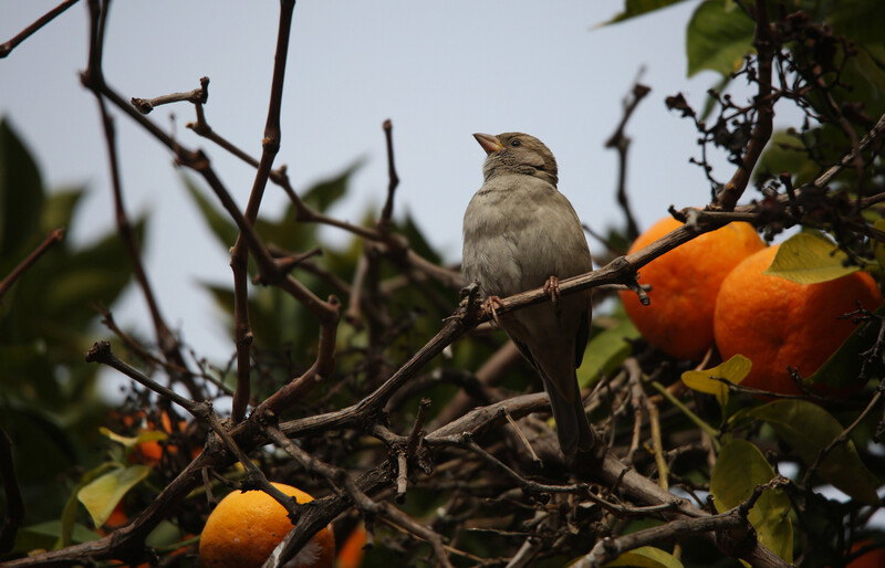 A sparrow perches on a branch in the West Bank city of Nablus on 28 January.