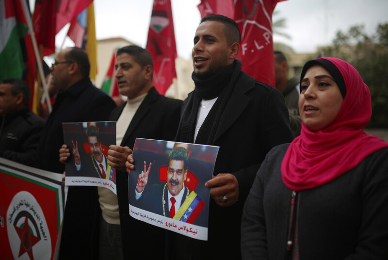 Supporters of the Democratic Front for the Liberation of Palestine, a leftist faction, rally in support of the Venezuelan President Nicolas Maduro in front of the Gaza City offices of UNSCO on 28 January. US President Donald Trump took the extraordinary step of recognizing Juan Guaido as the interim president in Venezuela.