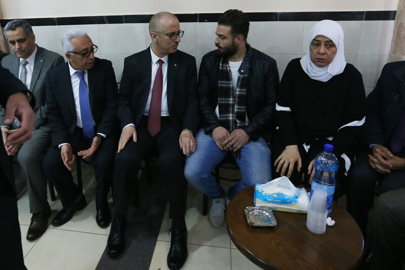 Rami Hamdallah, de facto prime minister of the Palestinian Authority, offers condolences to the family of Hamdan al-Arda, a businessman killed by Israeli forces in December, after Israel transferred his remains, West Bank city of Ramallah, 29 January.