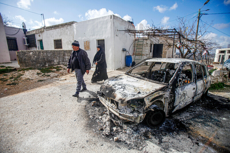 Palestinians walk by a charred car after it was set on fire by Israeli settlers in the village of Jalud, south of the West Bank city Nablus, 30 January.
