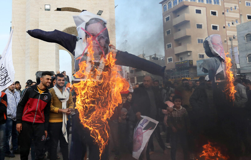 Palestinians burn effigies depicting Israeli Prime Minister Benjamin Netanyahu and national security minister Itamar Ben-Gvir during a protest in Rafah, southern Gaza Strip, on 4 January. Ben Gvir, a far-right disciple of the genocidal rabbi Meir Kehane, visited Jerusalem’s al-Aqsa mosque complex in a move that drew international condemnation.