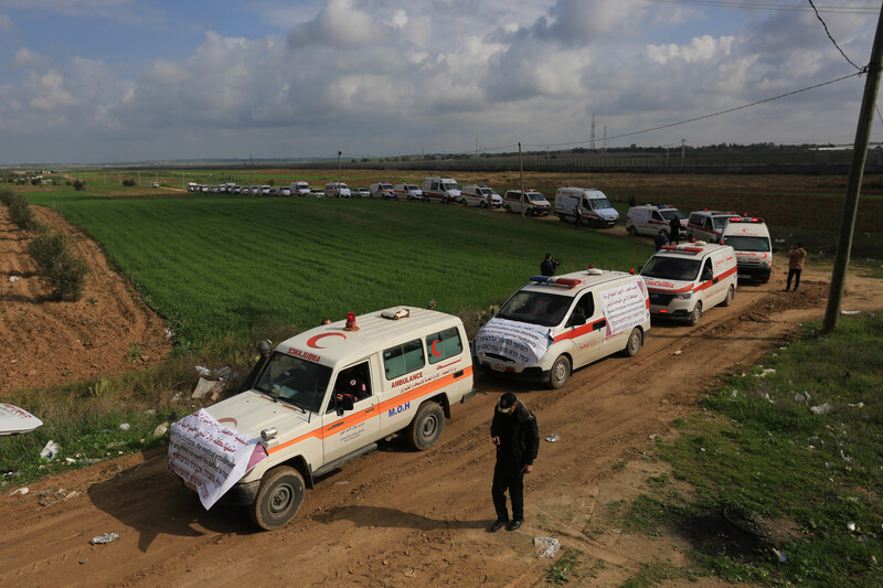Palestinian ambulance drivers protest east of Gaza City against the Israeli authorities’ blockade on the entry of medical devices into the territory, 9 January.