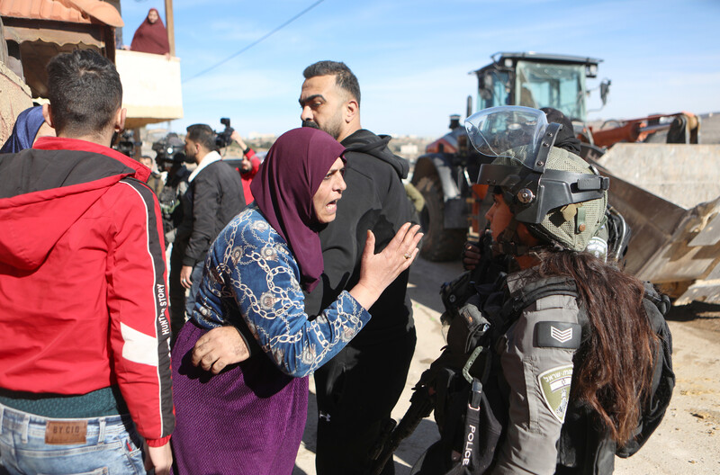 Palestinians react as Israeli troops stand guard during the demolition of two houses in al-Baqa’a village, near the southern West Bank city of Hebron, on 11 January. Israeli forces tore down a three-storey home, under construction and belonging to Azzam Jaber and his family.