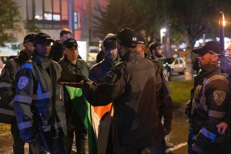 An Israeli Border Police officer confiscates a Palestinian flag during a rally against Prime Minister Benjamin Netanyahu’s new hard-right government in the city of Tel Aviv, 14 January.
