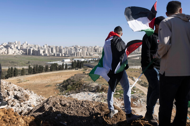 Palestinians protest on lands between the villages of Rafat and Qalandiya, near the West Bank city of Ramallah, which Israeli settlers have razed in recent days, supposedly in order to erect a new outpost, 20 January.