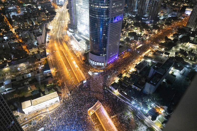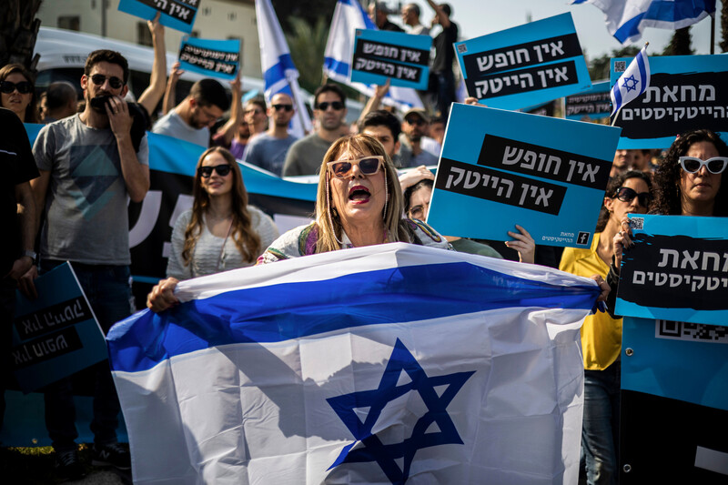 Israeli protesters in Tel Aviv attend a mass rally against Prime Minister Benjamin Netanyahu’s new hard-right government, 21 January.