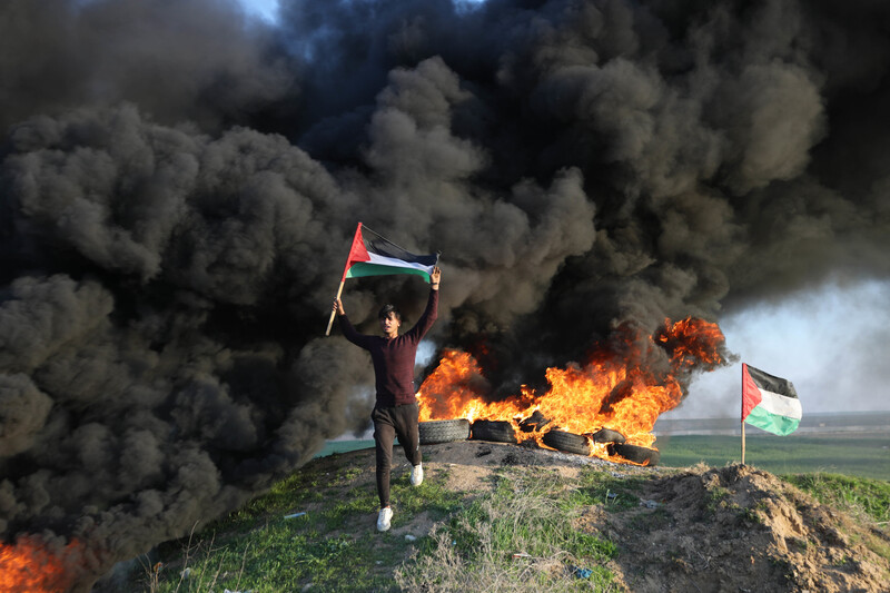 Palestinians burn tires near the boundary fence east of Gaza City during a protest against the killing of nine Palestinians during an Israeli raid in Jenin refugee camp, 26 January.