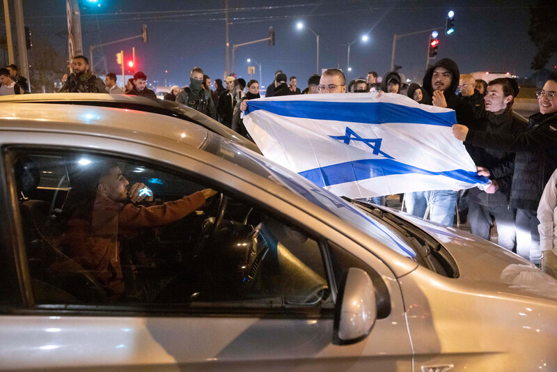 Israeli right-wing protesters block Palestinian motorists and call for the deportation of Palestinians at the entrance to the Shuafat neighborhood in East Jerusalem, 28 January.