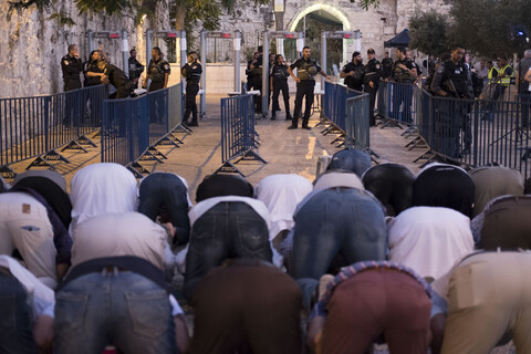Palestinian worshippers pray outside Jerusalem’s Old City on 28 July. Israel barred men under the age of 50 from entering the al-Aqsa mosque compound for Friday noon prayers.