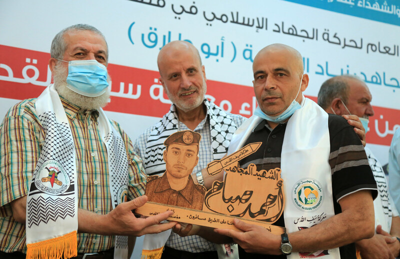 Palestinians attend a ceremony in Gaza City honoring the families of fighters killed during Israel’s attacks the previous month, 3 June.