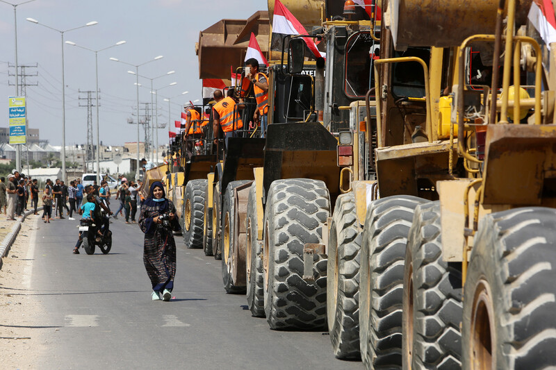 A convoy of bulldozers, excavators and trucks loaded with construction equipment provided by Egypt arrives at the Palestinian side of Rafah crossing, southern Gaza, on 4 June. Egypt sent an aid convoy to Gaza to “prepare the ground for reconstruction” following widespread destruction during the Israeli offensive the previous month. Egypt’s heavily secured Rafah crossing is the Gaza Strip’s only passage to the outside world not directly controlled by Israel.