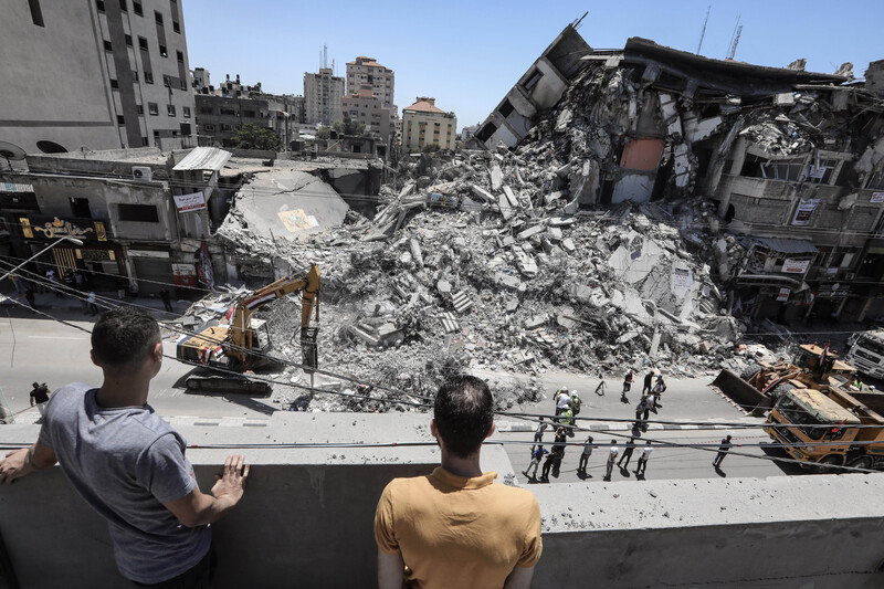Palestinian workers remove the rubble from Gaza City’s Hanadi Tower destroyed in Israeli airstrikes the previous month, 21 June.