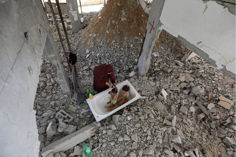 A Palestinian woman bathes her children on the rubble of their destroyed home in Beit Hanoun, northern Gaza Strip, on 12 June. Residents of Beit Hanoun lack water and electricity due to the recent Israeli bombardment and destruction in the northern Gaza Strip.