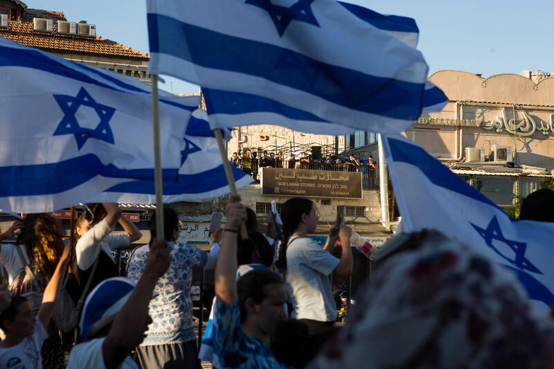 Israeli ultranationalists wave flags in front of Palestinians during the annual Jerusalem Day march outside the Damascus Gate to Jerusalem’s Old City on 15 June. The annual march was originally planned for 10 May but was stopped short by rockets fired by Hamas in Gaza towards Jerusalem. The annual march celebrates Israel’s capture of the eastern sector of Jerusalem in the 1967 War.