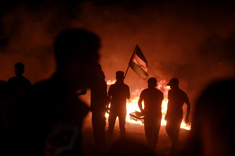 Palestinian protesters throw a burning projectile towards Israeli forces during a demonstration east of Gaza City by the boundary with Israel on 15 June. Palestinians were demonstrating against the Israeli ultranationalist flag march in Jerusalem’s Old City.