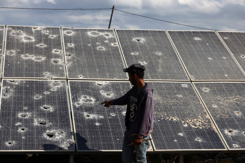 A Palestinian farmer points out solar panels damaged during the May offensive in northern Gaza’s Beit Lahia, near the boundary with Israel, on 18 June.
