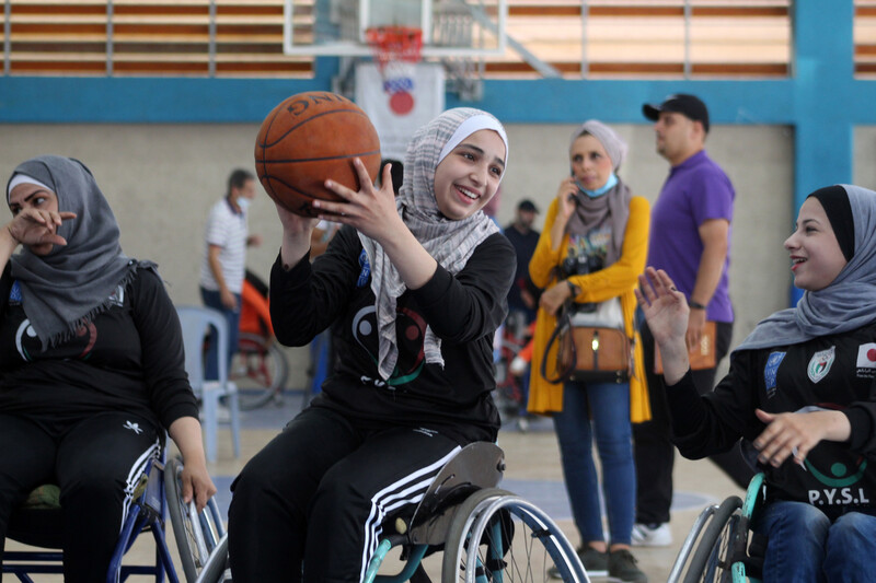 Palestinian women take part in a wheelchair basketball tournament organized by the Palestinian Olympic Committee and the United Nations Development Program at a Gaza City club on 22 June.