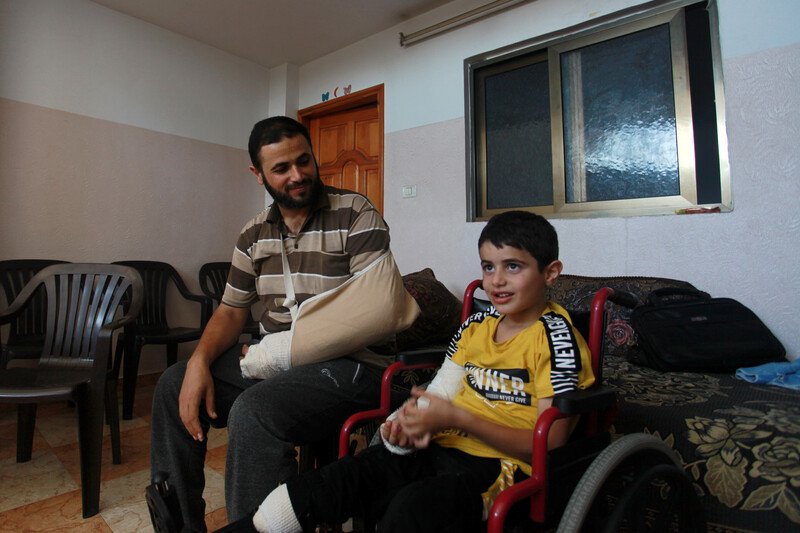 Saleh Hamid, 7, whose leg was partly amputated during the recent Israeli offensive, at his Gaza City home on 24 June. Ahmed Hamid, Saleh’s father, says that his child’s injury deprived him of his dream of becoming a professional football player.
