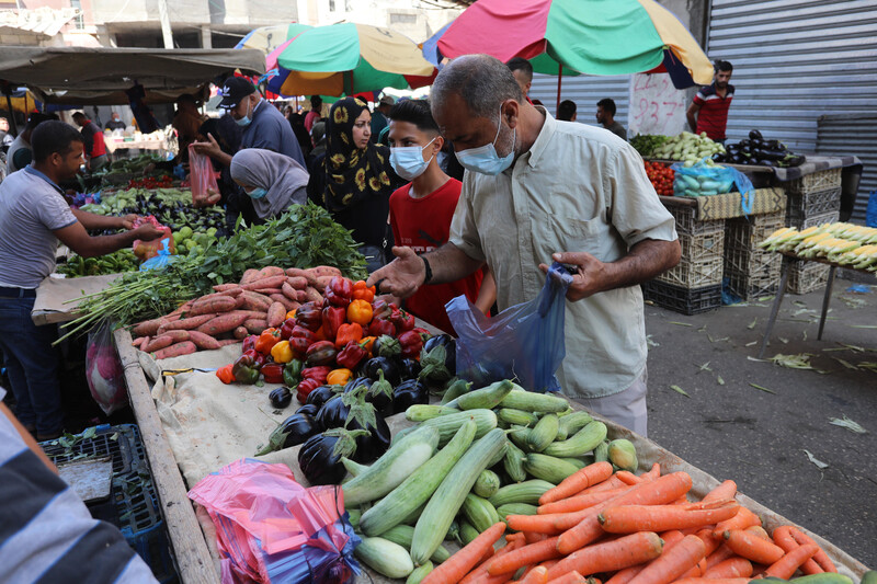 Palestinians shop at a weekly market in Deir al-Balah, central Gaza, 29 June. The authorities in Gaza reopened the popular markets after closing them to slow the spread COVID-19.