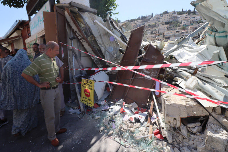 Palestinians inspect the rubble of a shop after it was demolished by Israeli occupation forces in the Bustan area of Silwan, a neighborhood of Jerusalem, on the pretext that it was built without a permit, 29 June. All 1,500 residents of the area are at risk of forcible transfer in favor of a Jewish archaeological park that settlers seek to establish at the site.