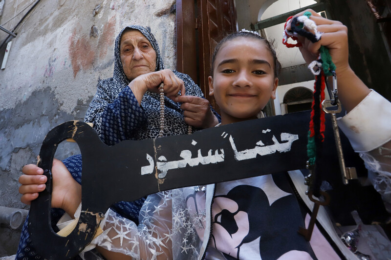 Ibtihaj Doula, 88, sits with her granddaughter at Gaza City’s Beach refugee camp on 5 June, the day that Palestinians mark Naksa Day to mourn the anniversary of Israel’s occupation of the West Bank and Gaza Strip in 1967.