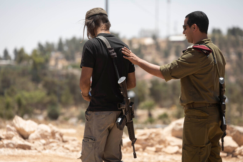 Israeli army commander Yehuda Rozilio escorts armed Jewish settlers during a demonstration held by Palestinians in Masafer Yatta in the southern West Bank following an Israeli high court ruling paving the way for the forced transfer of eight Palestinian communities in the area, 10 June.