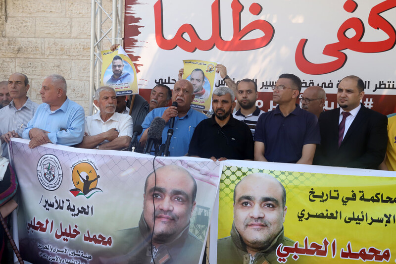 Khalil El Halabi, the father of persecuted aid worker Mohammed El Halabi, speaks during a protest in front of the Gaza City offices of the International Committee of the Red Cross, on 15 June. An Israeli court issued a guilty verdict against the younger El Halabi after a six-year trial over manufactured “terror” financing charges rejected by the international Christian charity World Vision, where El Halabi worked before his arrest.