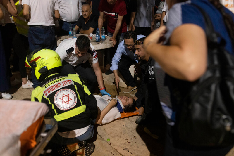 Medics treat one of two protesters injured after they were run over intentionally by an Israeli scooter driver during a protest marking 55 years of occupation, in Tel Aviv on 19 June.