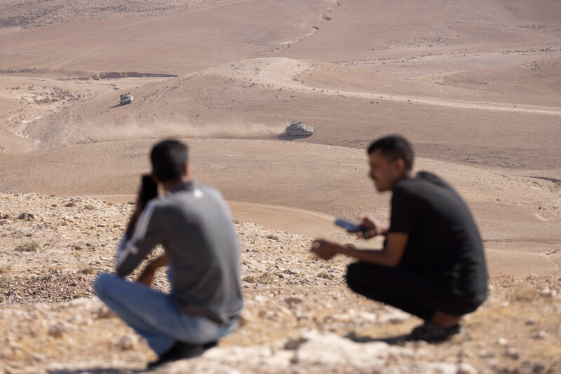 Palestinian residents of the village of Al Majaz watch an Israeli military training exercise in the Masafer Yatta area in the southern West Bank, which Israel defines as a military firing zone, 21 June.
