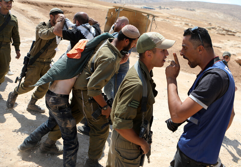 Israeli soldiers confront Palestinian activists during a protest in Masafer Yatta, south of the West Bank city of Hebron, on 22 June.
