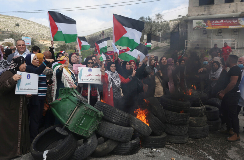 Palestinian women protest on International Women’s Day in Burqa village, near the West Bank city of Nablus, on 7 March.