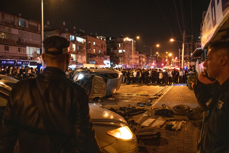 The overturned car used by Palestinian assailant Dia Hamarsheh in Bnei Brak, the Tel Aviv suburb where five people were killed in a shooting attack, 27 March.