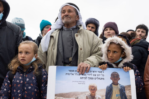 Palestinian children wave a flag across the street from Israeli settlers during a weekly protest in the East Jerusalem neighborhood of Sheikh Jarrah, 24 March. Palestinians are protesting the ethnic cleansing and Judaization of the neighborhood and of Jerusalem, particularly efforts to evict families to make way for Israeli settlers.