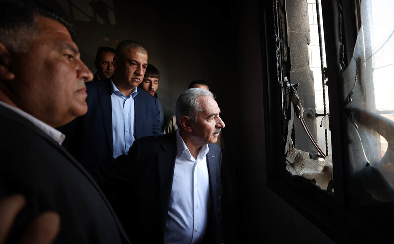Palestinian Authority Prime Minister Mohammad Shtayyeh tours a home damaged during a rampage by settlers in Huwwara, a town near the northern West Bank city of Nablus, in late February, 1 March.