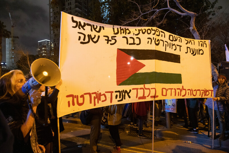 Anti-occupation activists take part in a protest against the Netanyahu government’s judicial reform, Tel Aviv, 18 March. The banner reads: “This is the flag of the Palestinian people, who have been denied democracy by Israel for 75 years. Democracy for Jews only is not democracy.”