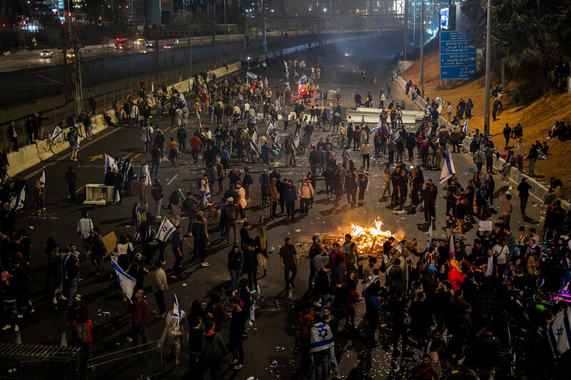 Israeli protesters block a highway in Tel Aviv following Benjamin Netanyahu’s dismissal of Yoav Galant, the defense minister, after the latter called on the government to halt its controversial judicial reform.