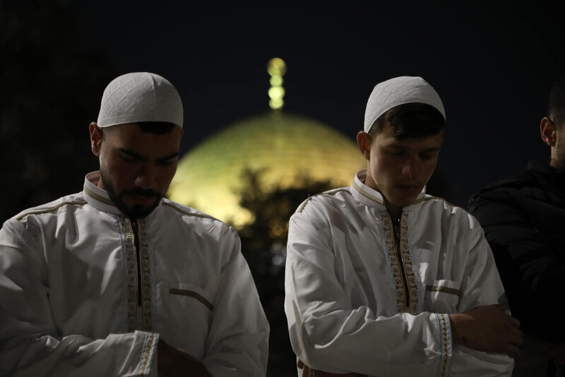 Palestinian Muslims offer the taraweeh night prayer observed during the fasting month of Ramadan at al-Aqsa mosque compound in Jerusalem, 28 March.
