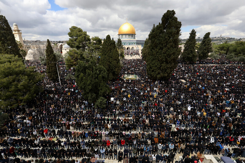 Palestinian worshippers attend the second Friday noon prayer of Ramadan at Jerusalem’s al-Aqsa mosque compound on 31 March.