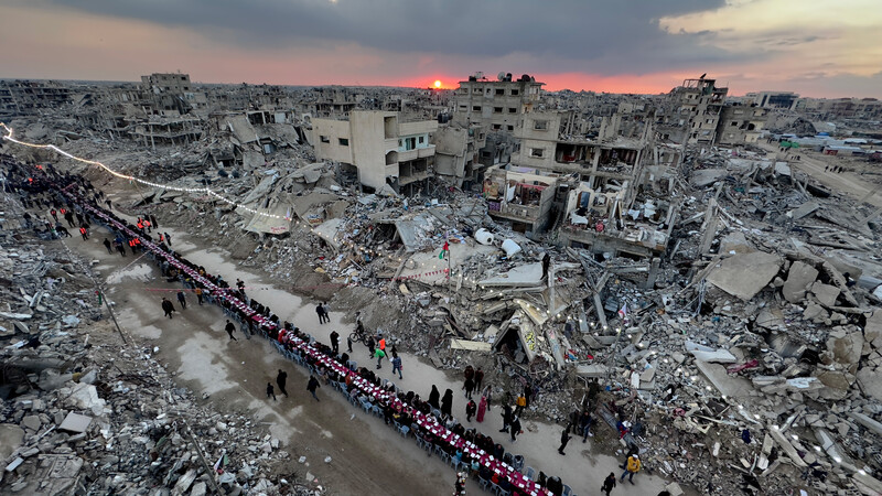 Palestinians break their Ramadan fast amid the destruction and debris during a mass iftar in Beit Lahiya, northern Gaza, on 15 March.