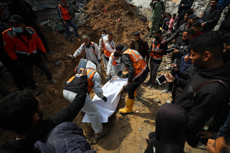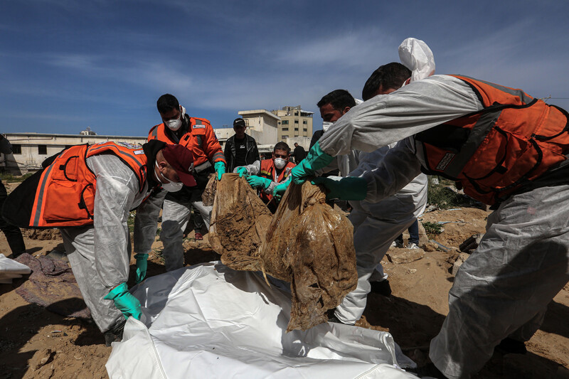 The bodies of Palestinians killed during Israeli raids and buried in a mass grave at Al-Shifa Hospital are exhumed for identification and proper burial, Gaza City, 13 March.