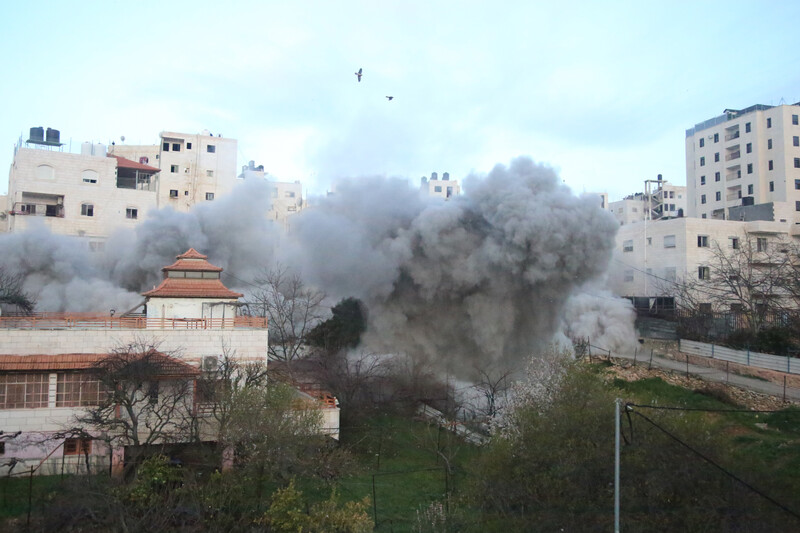 Israeli forces blow up the home of Ahmad al-Haymouni in the West Bank city of Hebron on 5 March. Al-Haymouni, together with Muhammad Misk, carried out a shooting and stabbing attack in Jaffa in October in which seven Israelis were killed and several others injured. Misk’s home was destroyed the same day in an act of collective punishment prohibited under international law.
