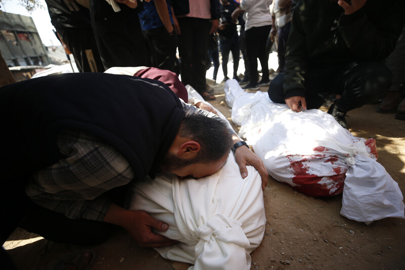 Mourners gather near the bodies of loved ones killed in Israeli strikes at Al-Ahli Arab Hospital, Gaza City, 24 March.