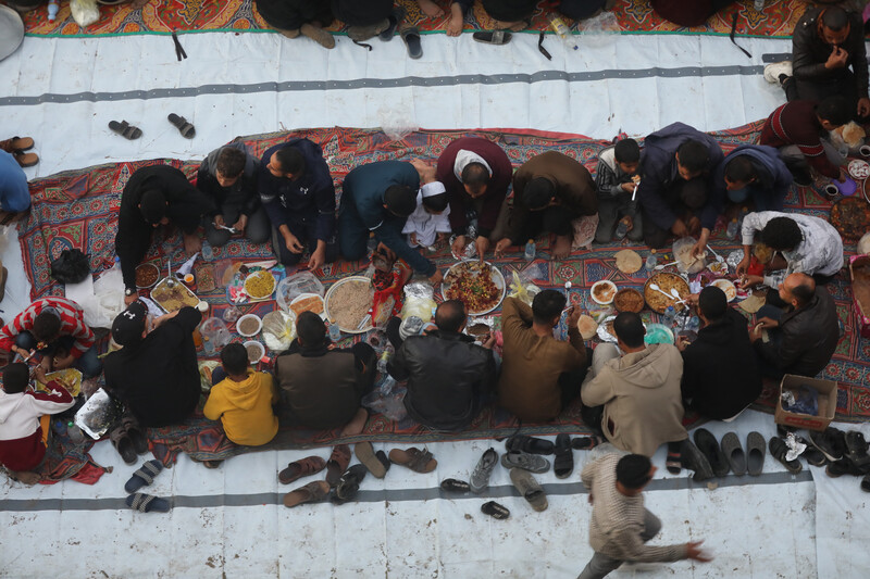 People sit for the first Iftar (breaking of the fast) of Ramadan in Rafah, southern Gaza, on 1 March.