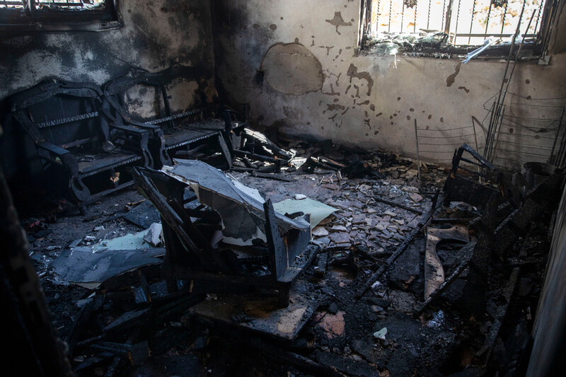 The interior of a home belonging to a Palestinian family in the West Bank village of Khirbet al-Marajim on 15 March after around 50 Israeli settlers stormed the village the previous night. The settlers threw stones at residents and set fire to three homes and a car while families were sleeping inside. In one of the rooms, two children were asleep when settlers abducted them and later released them in a different location.