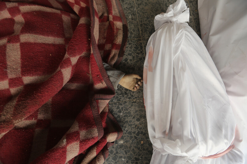The bodies of people killed in an Israeli airstrike in central Gaza are seen the morgue of Al-Ahli Arab Hospital in Gaza City on 18 March.