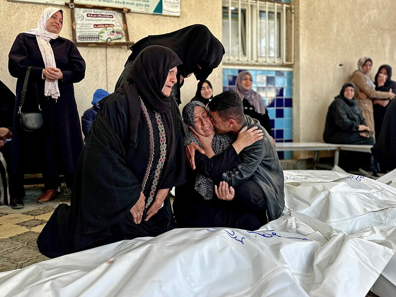 People mourn over the bodies of relatives killed in Israeli airstrikes overnight at the Gaza European Hospital in Khan Younis, southern Gaza, 18 March.